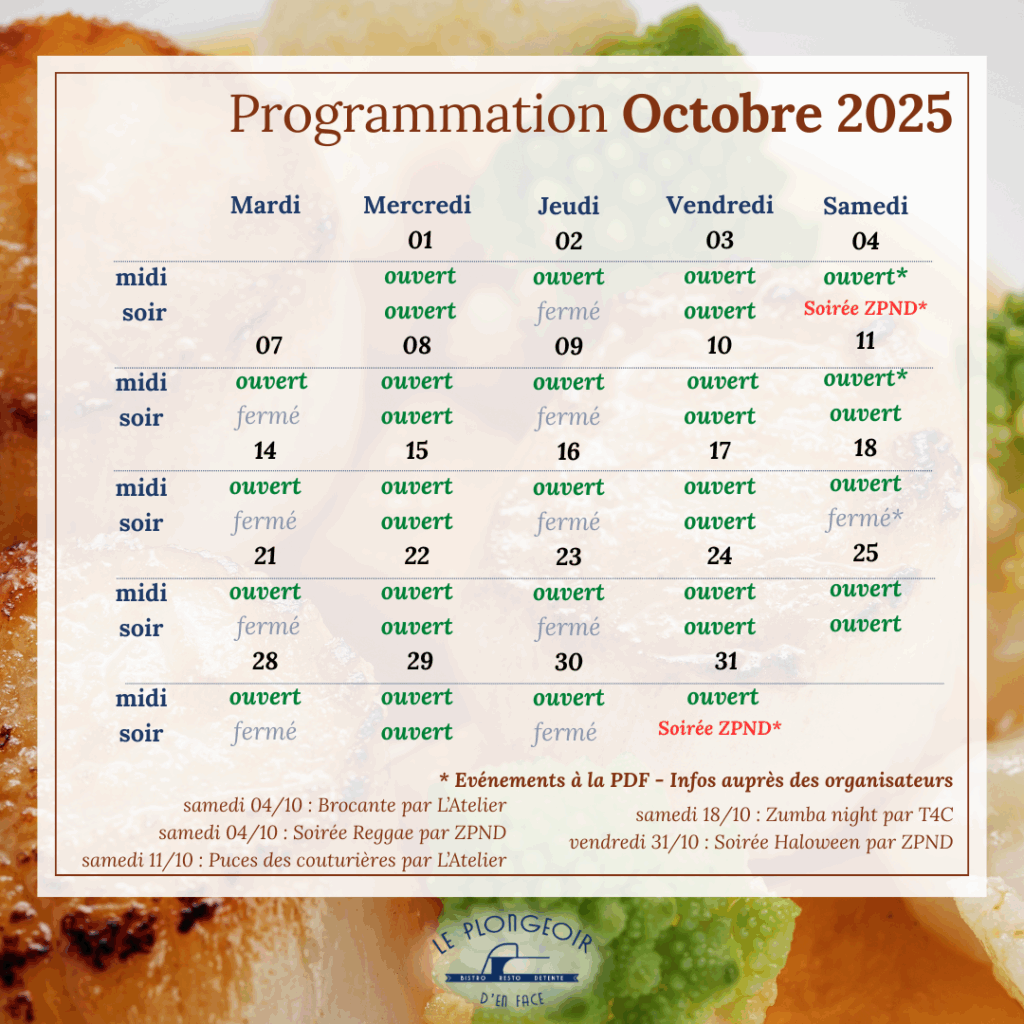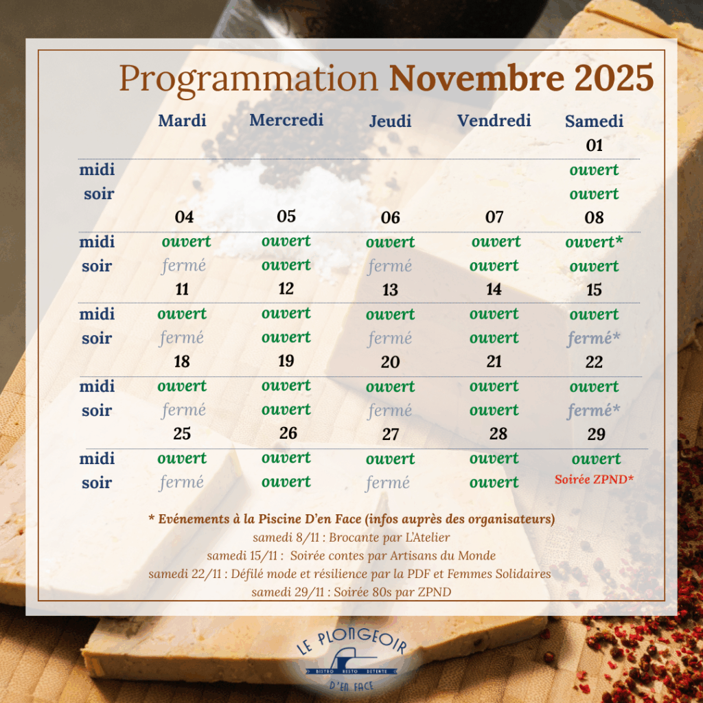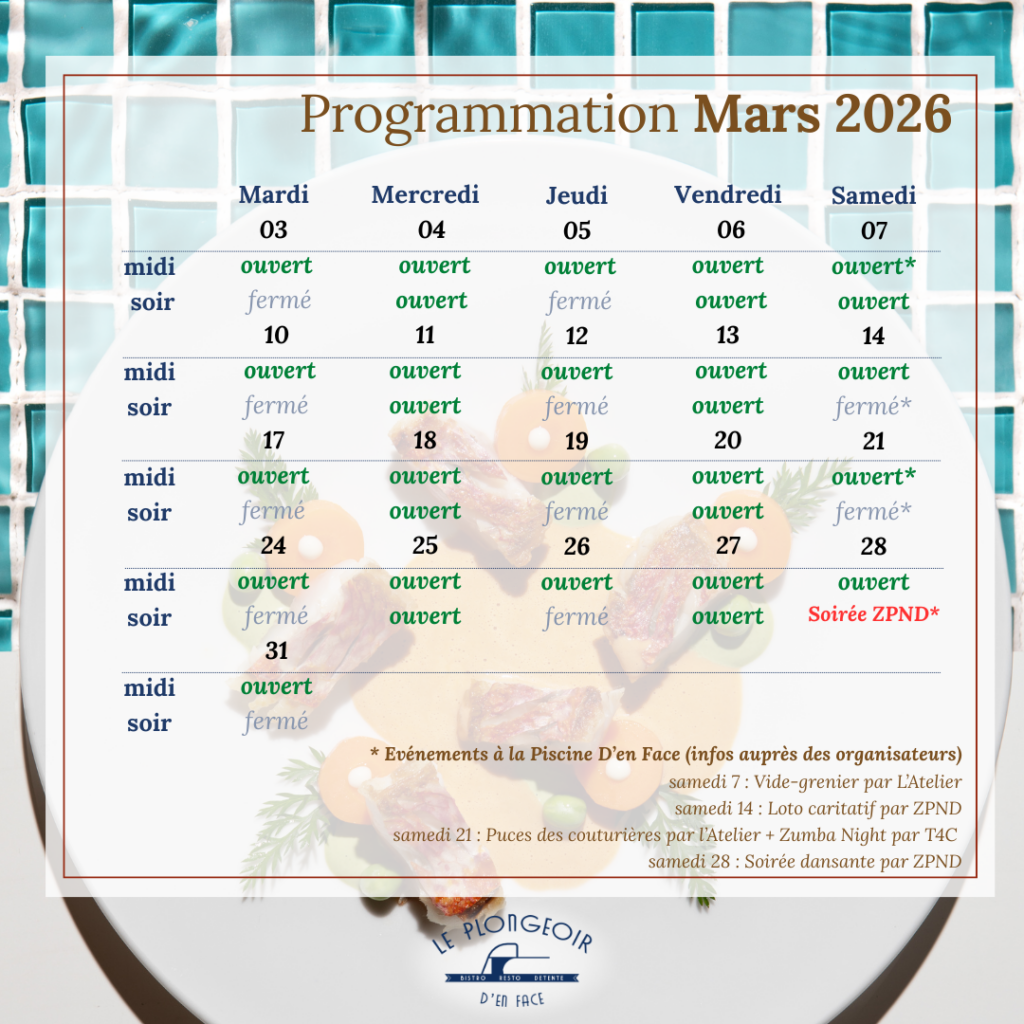 * Ouverture le samedi selon la programmation de La Piscine D’en Face, suivez notre actualité régulièrement sur les réseaux sociaux ! Notre planning est publié chaque mois à la page « Les Soirées »